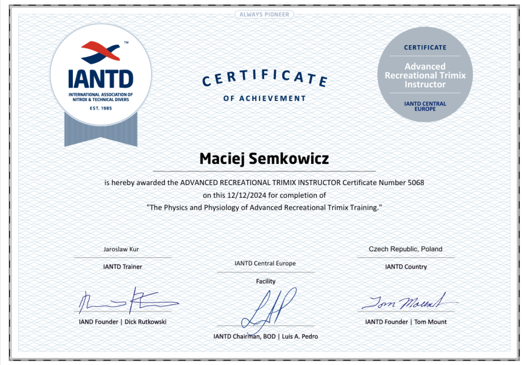 nurkuję od ponad 10 lat. W 2018 roku zrobiłem stopień instruktora PADI, w 2021 uzyskałem stopień MSDT. Moją pasją jest nurkowanie – nie ma znaczenia czy woda ma 25 C czy 4 C zawsze staram się czerpać przyjemność z nurkowań. Podczas szkoleń zwracam szczególną uwagę na jakość i bezpieczeństwo dlatego grupy są maksymalnie czteroosobowe.